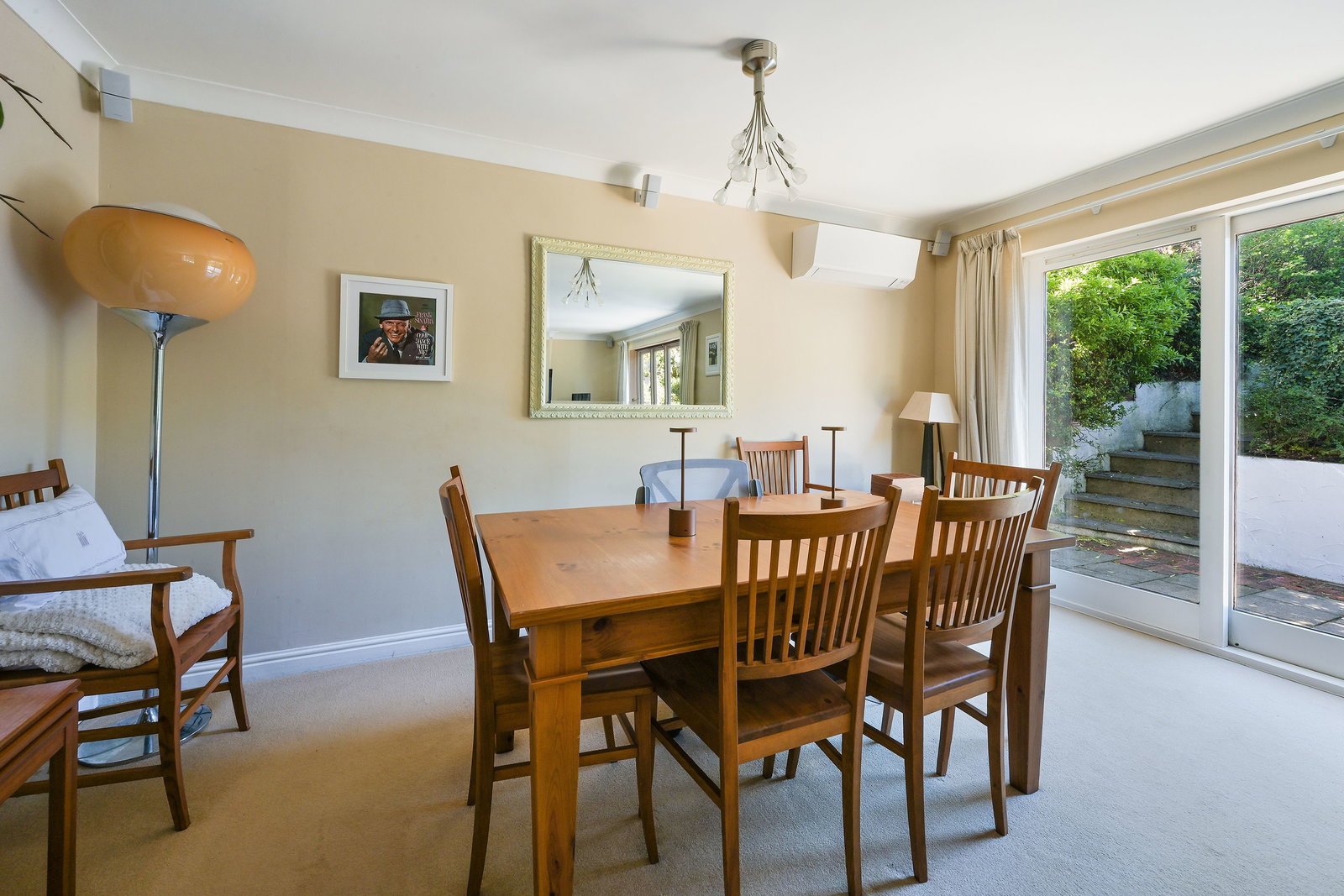 To the rear, the spacious lounge/dining room provides an inviting environment for both relaxation and entertaining. A charming feature fireplace creates a focal point, while air conditioning ensures comfort throughout the seasons. Patio doors open directly onto the garden, seamlessly blending indoor and outdoor living. The addition of an integrated sound system, featuring Bose and Pioneer components, enhances the space with high-quality audio, perfect for hosting or unwinding.