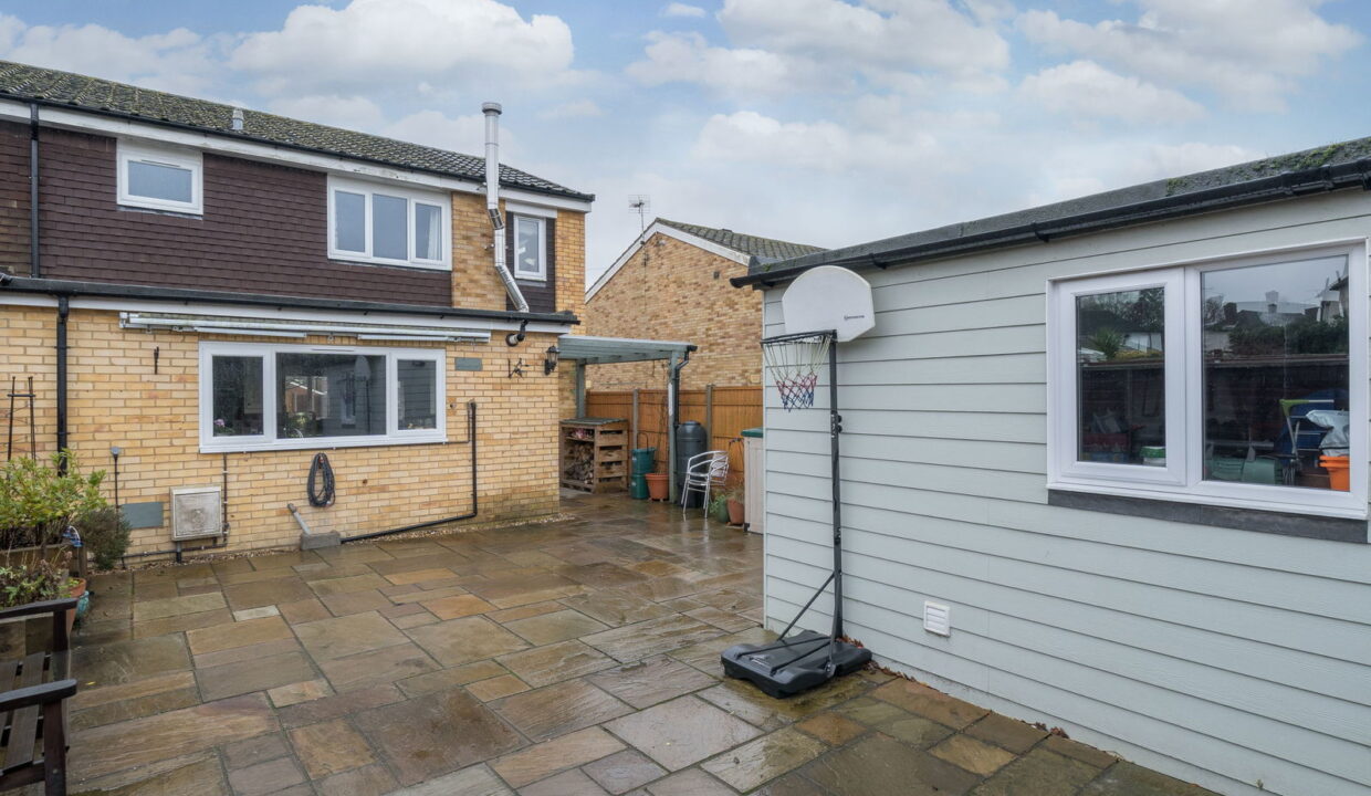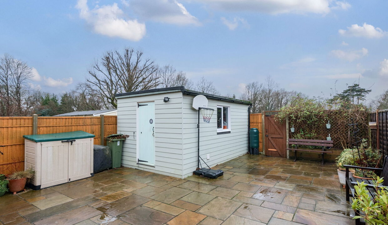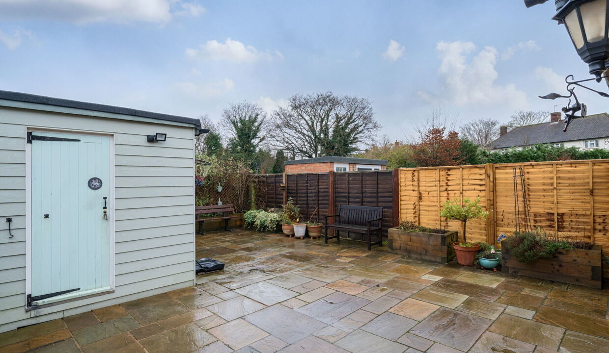 The rear garden is a covered patio area with raised planters leading to a summer house equipped with power and light, perfect for use as a home office, gym, or playroom. A gate at the rear provides direct access to a park, making this an ideal choice for families with children or those who enjoy outdoor activities.