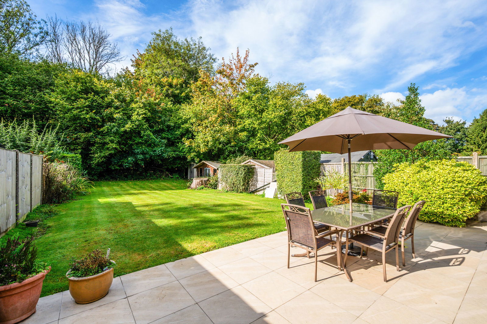 Upstairs, the home boasts four well-sized bedrooms, the master serviced by a contemporary ensuite with stylish walk-in shower, with the others by the family bathroom updated to the same high standard, all providing flexibility for busy households. The garden is well maintained and private, with a large patio directly off the back of the home, perfect for alfresco entertaining or enjoying peaceful evenings outdoors. Additional outbuildings include a charming summer house, a secure store, and a substantial double garage to the front, offering excellent storage or potential for conversion (STPP).