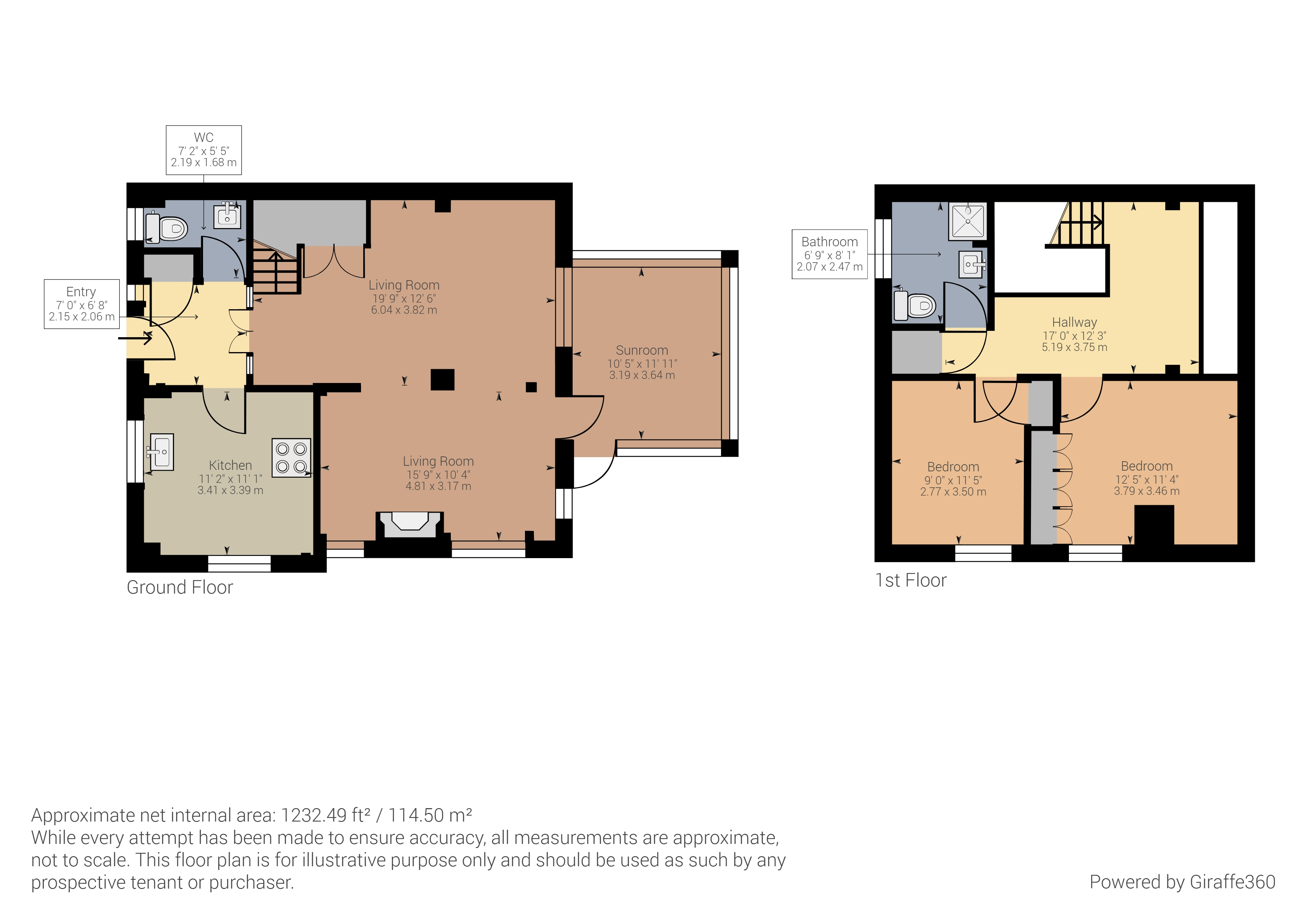 A feature spiral staircase leads to the first floor which has two good sized double bedrooms with built in wardrobes and a bathroom.