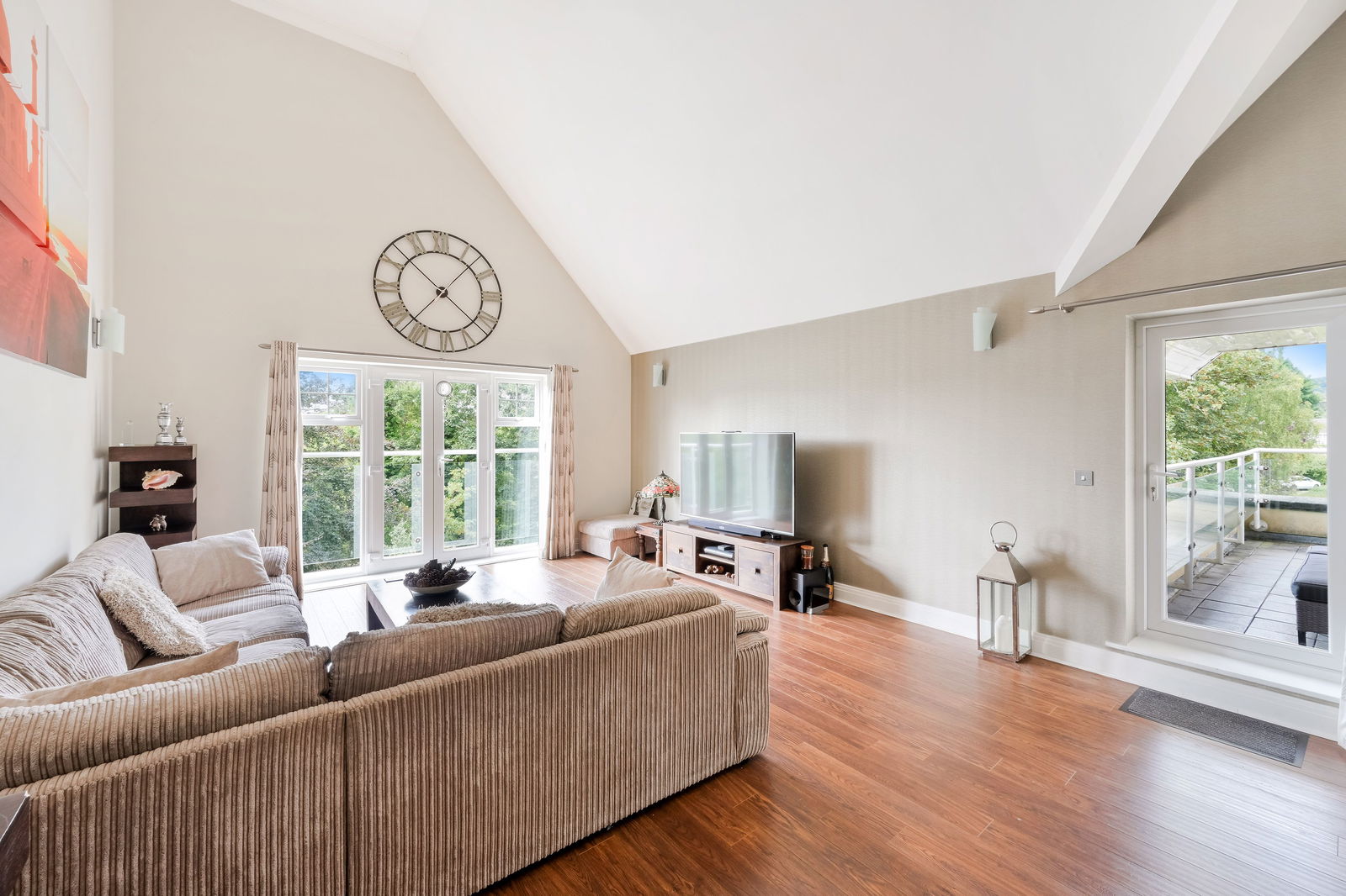 The accommodation features a spectacular living/dining room with vaulted ceilings and a mezzanine landing/reception area, creating a striking sense of space. From here, you can step out onto a private balcony to enjoy the views. The sleek kitchen is fitted with premium Miele and Neff appliances, including fridge freezer, dishwasher, and washing machine, and is completed with elegant stone worktops.